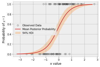 obs = pm.Bernoulli("obs", p=p, observed=y, shape=x.shape[0])lm = logistic_model(x, y)